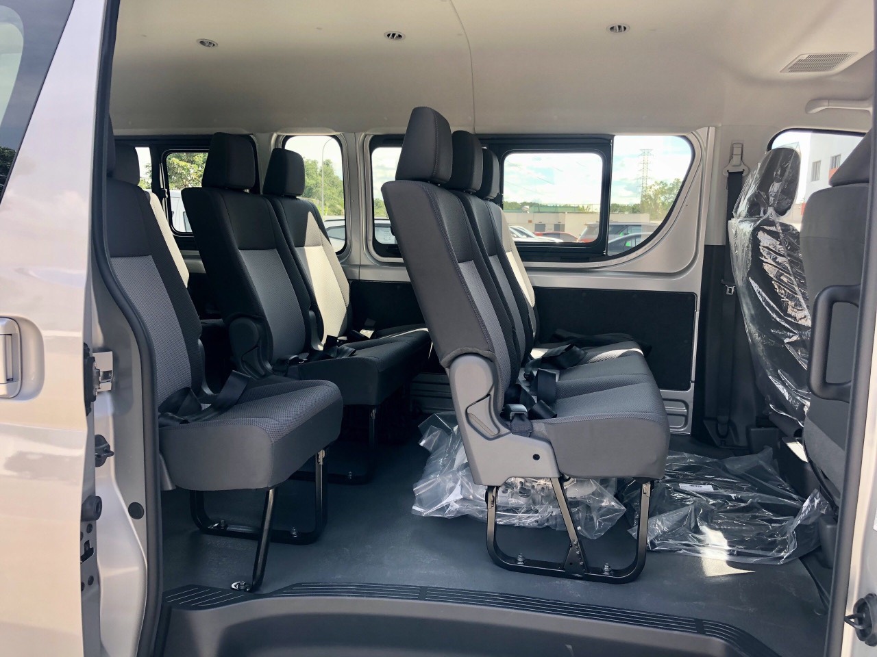 Khoang hành khách của Toyota Hiace 2023 có tất cả 4 hàng ghế. Hàng ghế đầu tiên có thiết kế 3 ghế liền mạch, 2 hàng ghế kế tiếp có bố trí 2+1 giúp hành khách ra/vào dễ dàng hơn. Hàng ghế cuối có 4 ghế liền mạch tương tự các đối thủ trong phân khúc.