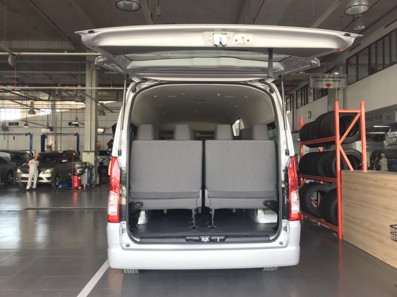 Nếu sử dụng tất cả các hàng ghế, không gian chứa hành lý của Toyota Hiace 2023 sẽ khá khiêm tốn. Đây cùng là tình trạng chung của các mẫu minibus 16 chỗ. Để gia tăng thêm dung tích, người dùng có thể gập hàng ghế cuối sang hai bên.