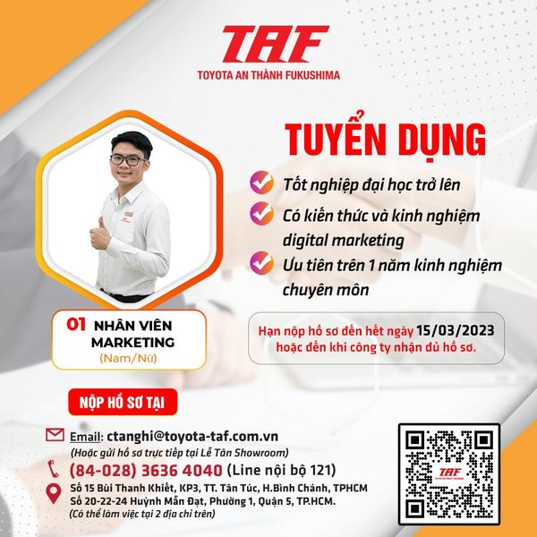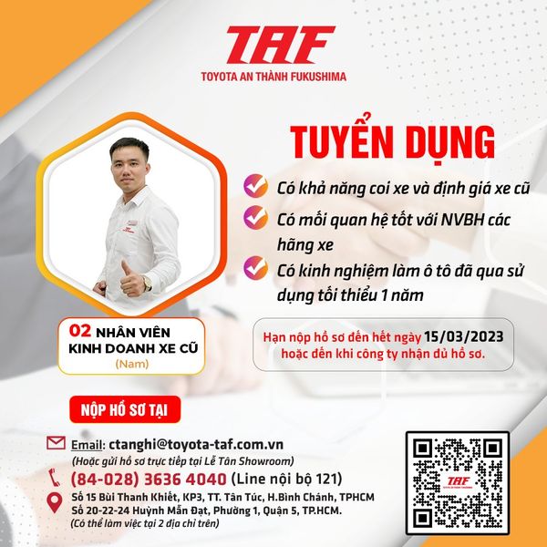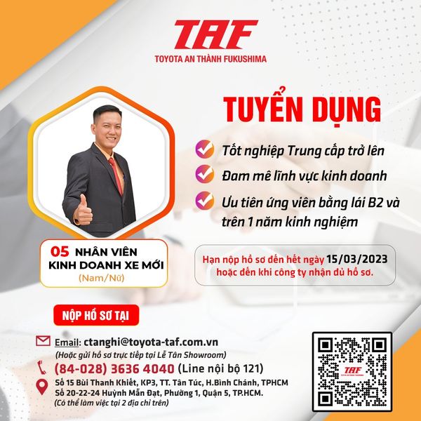 Với mong muốn mở rộng hoạt động kinh doanh, Toyota An Thành Fukushima – 𝐓𝐀𝐅 thông báo tuyển dụng tháng 02.2023 các vị trí như sau: